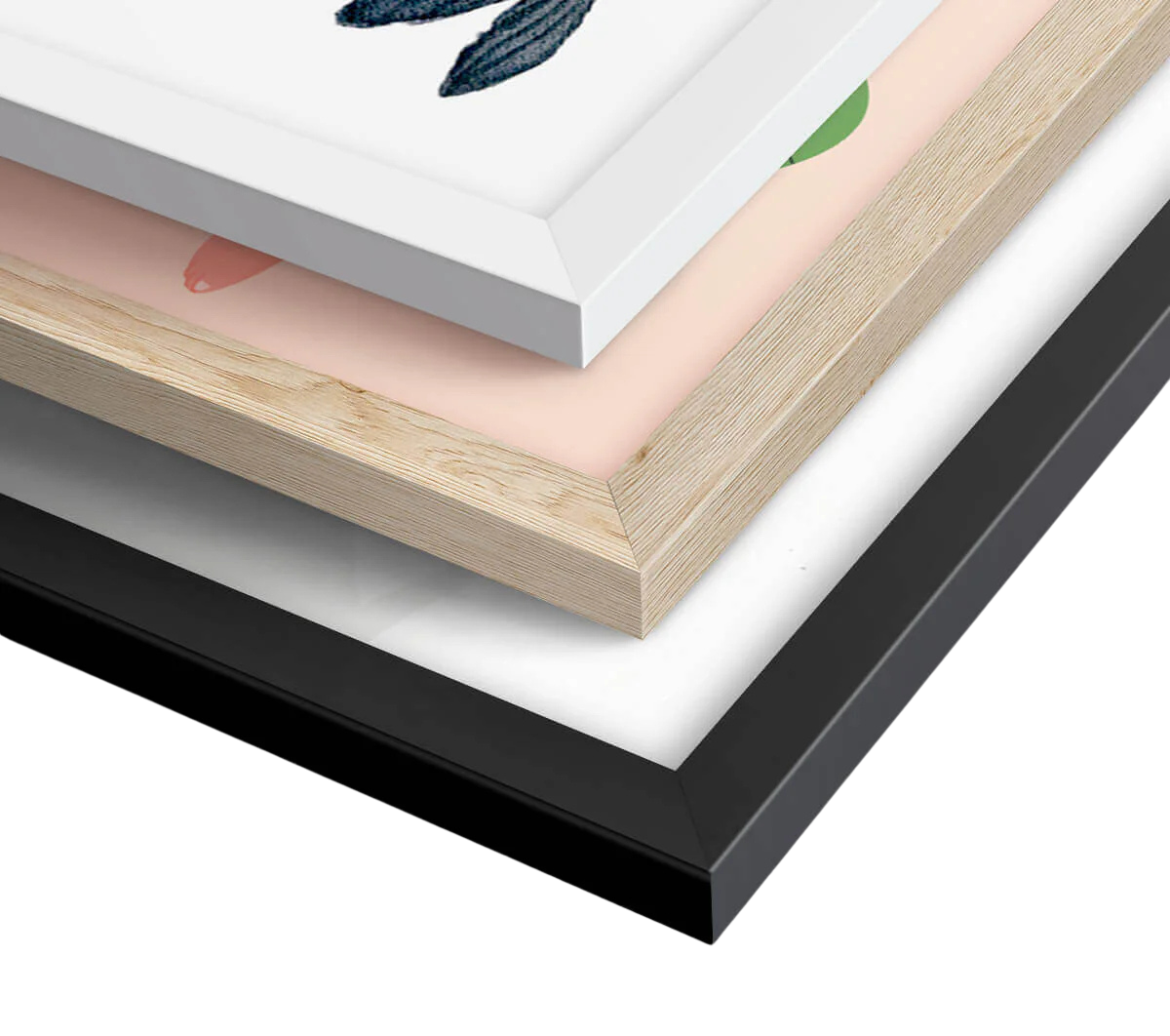 Our frames are crafted from durable pine wood, offering a sturdy yet lightweight structure with a beautiful natural wood grain unique to each frame. Frame thickness ranges depending on print size.